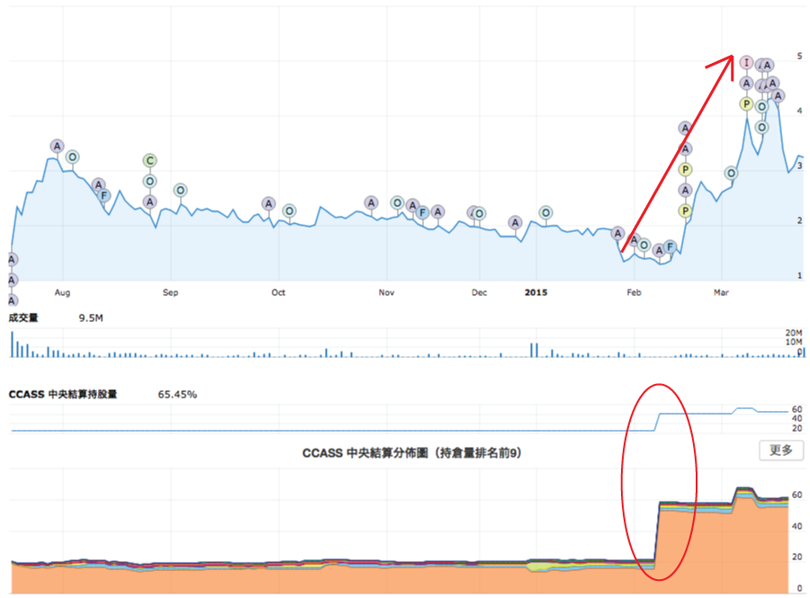 在圖中所見股價於2月9日低位有37%的實物股票存入 CCASS 系統(下面紅色圓圈),及後股價在一個月內由1.3爆升至最高5.41,升幅高達316%!有理由推斷大股東在低位把股票存入 CCASS 後把股價炒高吸引散戶入場追貨,然後乘機在高位沽貨離場。