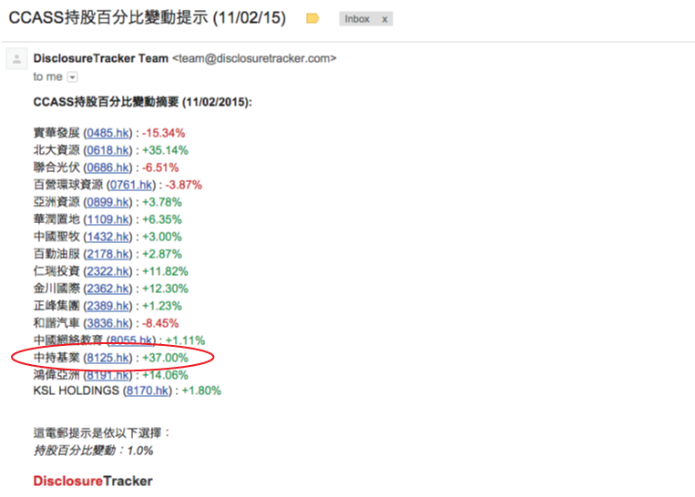 DT系統設有 CCASS 持倉異動電郵,每天掃描超過1700隻股票的 CCASS 持倉情況,一有異動便會以電郵形式通知各用戶,助你搭上大戶順風車!